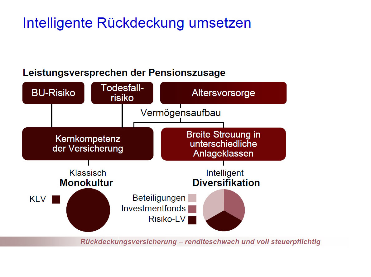 Durch eine breite Streuung in unterschiedlichen Anlageklassen, die nicht mit einander korrelieren, zum Beispiel durch ein Anlageportfolio in geschlossenen Beteiligungen und Investmentfonds, wird der Liquiditätsaufwand für die Finanzierung der Pensionszusage gegenüber einer Rückdeckung mit einer Lebensversicherung erheblich gesenkt.