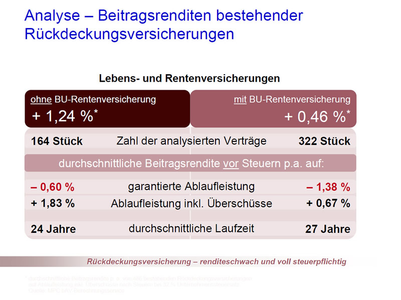 Bei einem konkreten Fall können wir Ihnen auf Wunsch zeigen, wie eine solche Alternative praktisch funktioniert und konkret ermitteln, welche finanzielle Vorteile sie im direkten Vergleich zu einer reinen Versicherungslösung bringt.